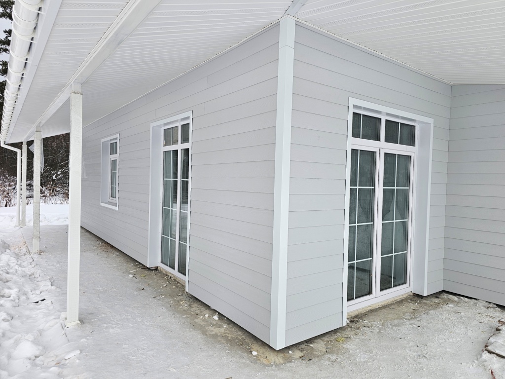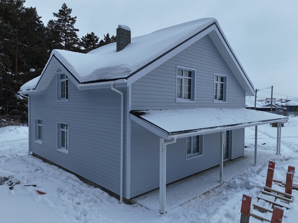 Выполнили отделку фасада каменного дома в с.Перевалово: 1, Стены дома утеплили базальтовым утеплителем Эковер Стандарт, плотностью 50кг/м3, в 2 слоя по 50мм. 2. Утеплитель закрыли мембраной Изоспан АМ 3. Подсистему сделали металлическую из несущих кронштейнов 50х50х150мм толщиной 2мм и Г-образных уголков 40х40мм толщина 1.2мм 4. Фасад обшили ёлочкой фиброцементным сайдингом Дековер цвет Silver. Внешние углы металлические сложные цвет 9003 белый. Откосы на окна металлические цвет 9003 белый 5. Свесы кровли и потолок на террасе подшили ПВХ Софит Docke Standard, T4 с центральной перфорацией, цвет пломбир. 6. Установили водостоки ПВХ Docke Premium цвет пломбир