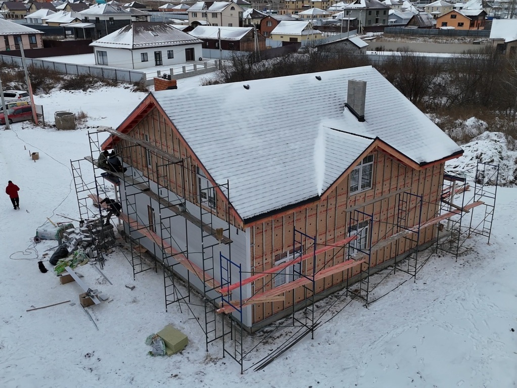 Обшили фасад в СНТ Весна, район Метелёва. 1. Весь дом утеплили Эковером толщиной 100мм 2. Фасад обшили металлосайдингом, цвет серый графит Ral 7024 3. Углы, откосы на окна и карнизы сделали белым цветом. 4. Первый этаж пристроя заказчик планирует обшить сайдингом ближе к лету, поэтому утеплитель закрыли стойкой к ультрафиолету плёнкой Изоспан AQ Proff. Весь остальной утеплитель, который под сайдингом, закрыли плёнкой Изоспан АМ Строительная компани 100 Домов. Фасадные работы под ключ Тел 89044975595