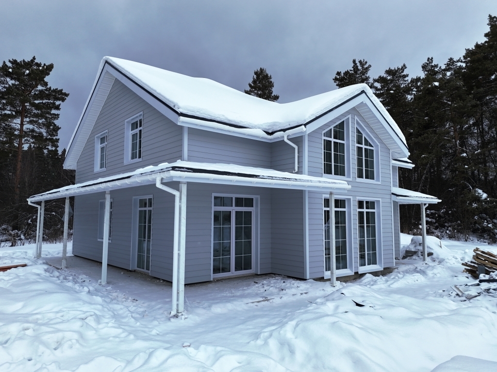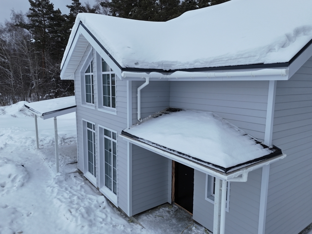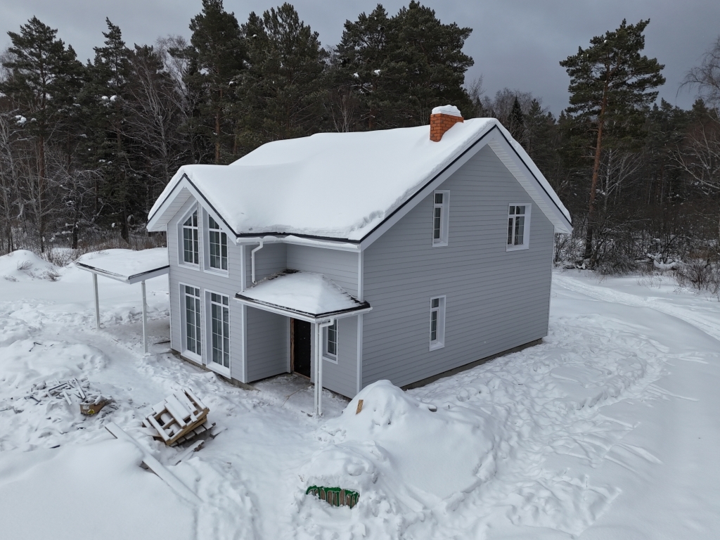 г.Тюмень Работы: 1. Стены дома были утеплены пенопластом. Сделали прорези в пенопласте, установили подвесы и запенили. 2. Фасад обшили металлическим сайдингом корабельная доска белого цвета ral 9003 3. Карнизы подшили этим же металлосайдингом. 4. Газовую трубу, идущую по стене, обошли гибочными изделиями из металла, и оставили её открытой.