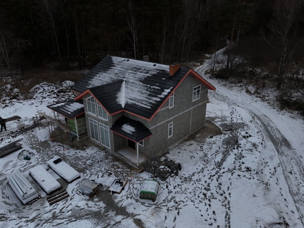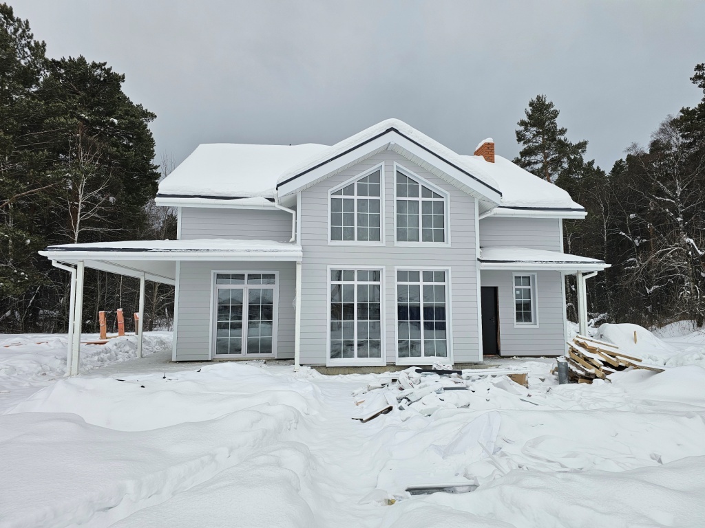 с.Червишево Обшили дом из керамзитоблоков виниловым сайдингом. 1. На стены дома смонтировали утеплитель Эковер стандарт. 2. Фасад обшили виниловым сайдингом Грандлайн светло-серого цвета. 4. Низ фасада выделили тёмно-серым профнастилом с8. 5. Углы дома и откосы на окна изготовили из металла в цвете серый графит