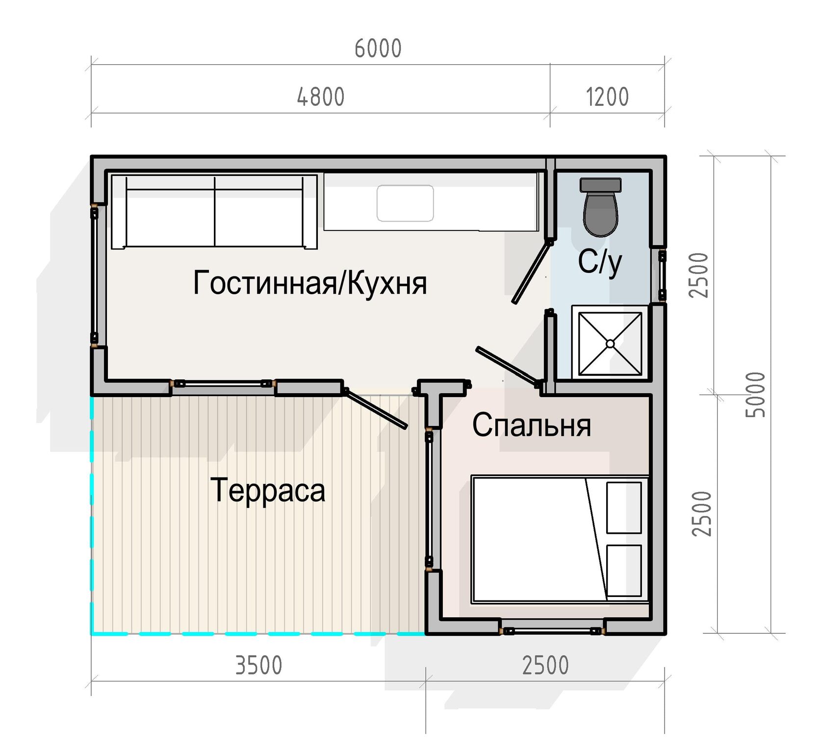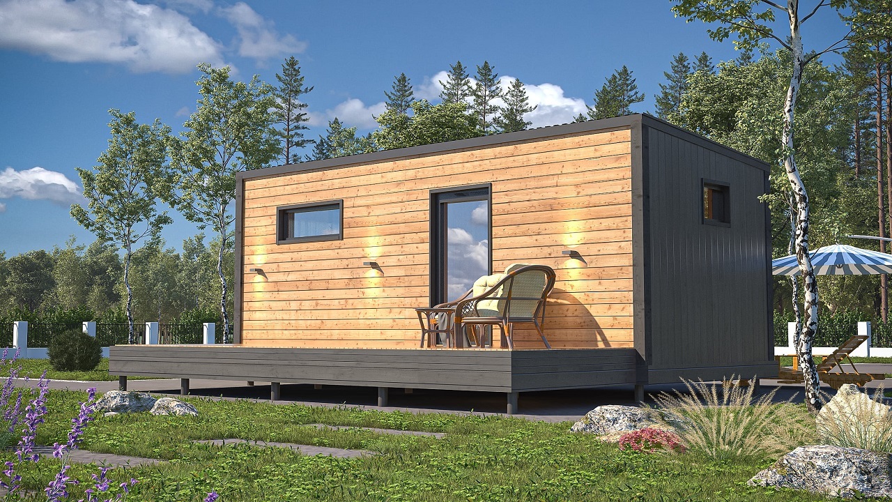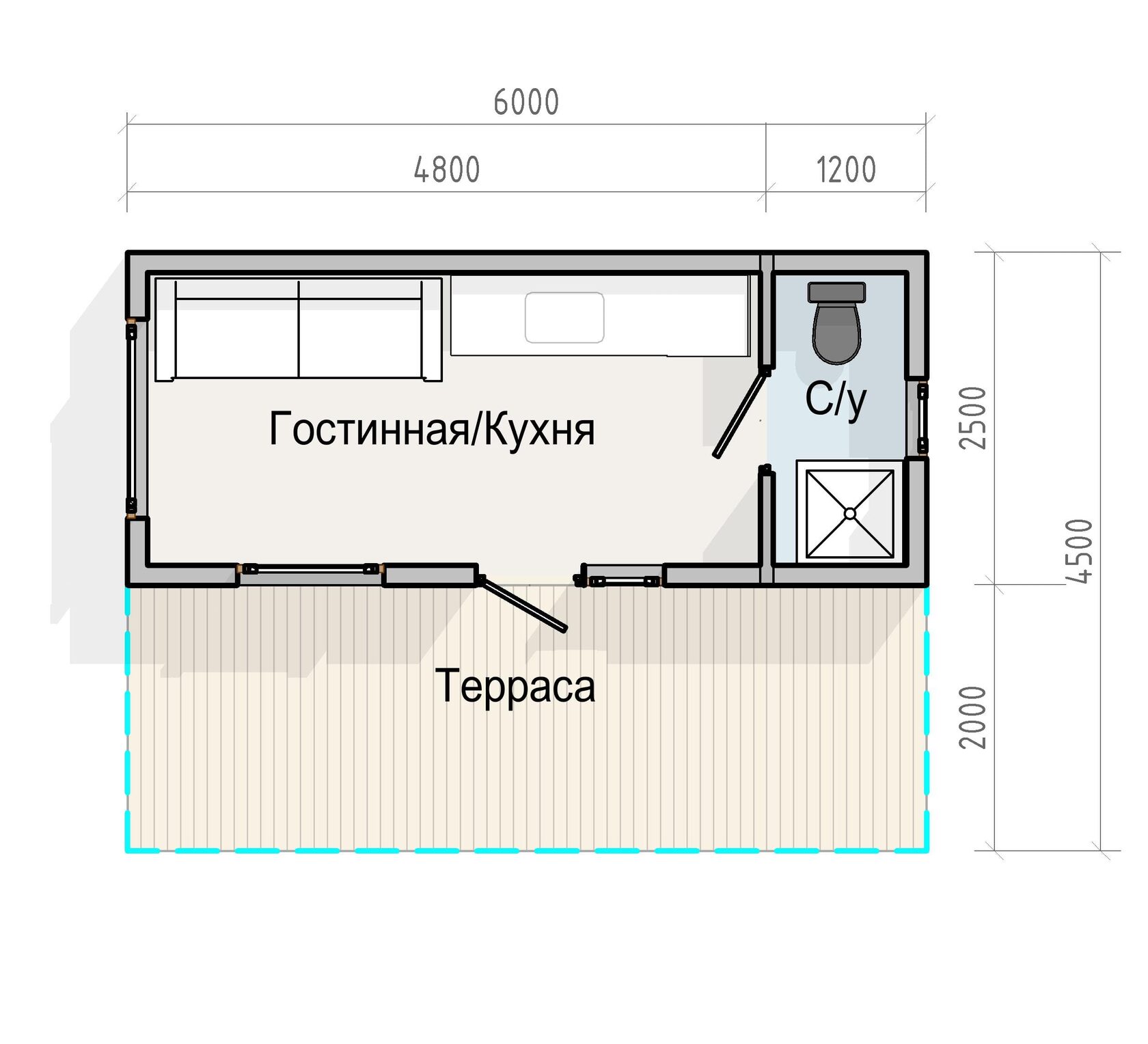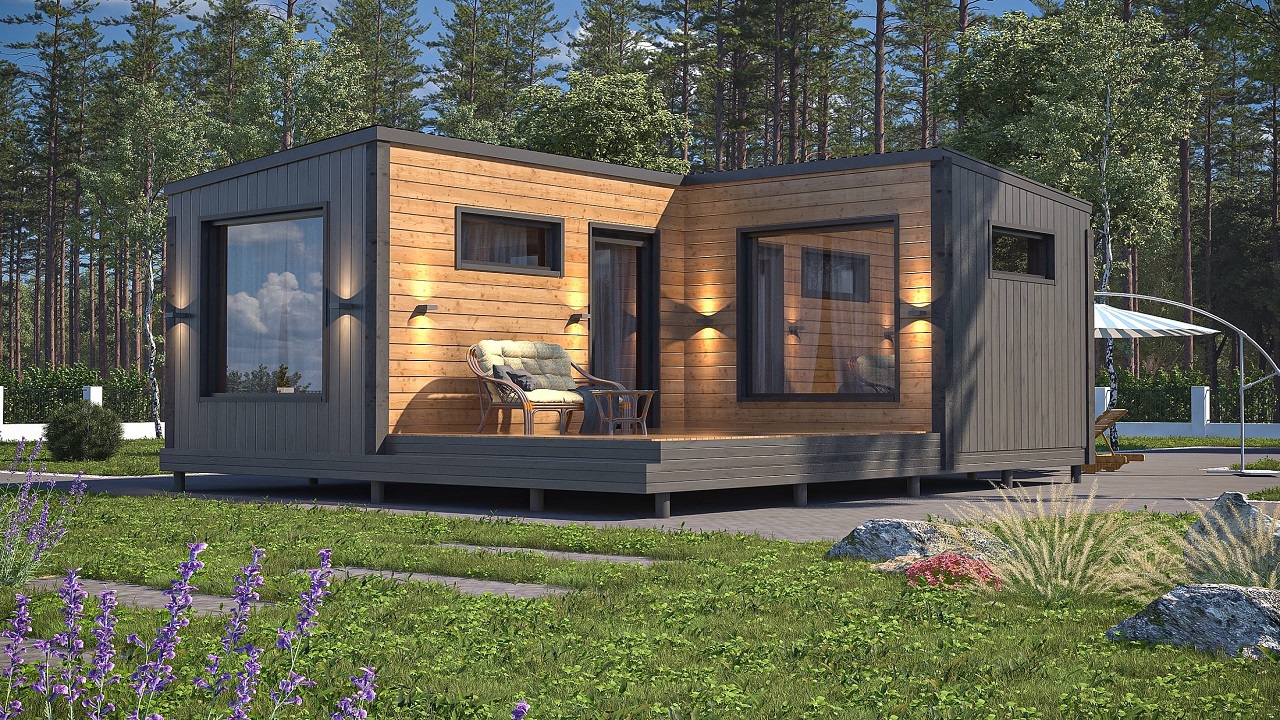 Несмотря на свои небольшие габариты, уместил в себе все самое главное: кухонная зона, совмещенная с гостиной, спальная, санузел, небольшая терраса. Площадь: 30м² Количество модулей: 2