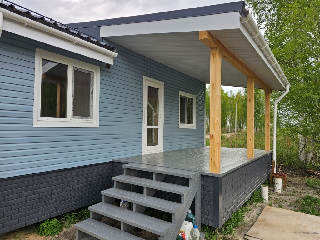 Общая площадь помещений дома 62м2. Площадь террасы 20м2 Планировка: кухня-гостиная 23м2 с выходом на террасу, спальня 8.8м2, комната отдыха 8.65м2, санузел 2.6м2, парная 3м2. Тамбур, холл, тех.помещение и кладовая общей S=15,22м2 Фундамент - свайно-винтовой, 34 сваи диаметром 89мм, длиной 3м с двумя лопастями. Силовой каркас - доска камерной сушки 50x150мм. Крыша вальмовая, на кровле металлочерепица монтеррей цвет 7024 серый графит, с дополнительной подкровельной гидроизоляцией. Коньки полукруглые с конусными заглушками Утепление стен перекрёстное 200мм, утепление пола и потолка перекрёстное 250мм, использовался утеплитель Knauf Insulation ПРОФ TS 034 Аквастатик (плита) Внутри утеплитель закрыли пароизоляцией СиЖ, толщина плёнки 200 микрон, стыки проклеили скотчем DELTA-MULTI-BAND-M60 На пол в доме постелили ЦСП толщиной 20мм под полусухую стяжку Фасад обшили фасадными панелями Дёке. Скомбинировали 2 цвета. По цоколю панели серии Slate цвет Валь-гардена. Основной фасад серия Stein цвет молочный Установили пластиковые окна: двухкамерный стеклопакет, пятикамерный профиль, с проклейкой монтажной пены пароизоляцией и ветрозащитой. Подшили все карнизы и потолок на террасе виниловым софитом Грандлайн серого цвета Установили плоскоовальные снегозадержатели по всему периметру кровли дома и террасы Установили ПВХ водосточную систему Грандлайн белого цвета на кровлю дома и террасы На террасу постелили террасную доску из лиственницы