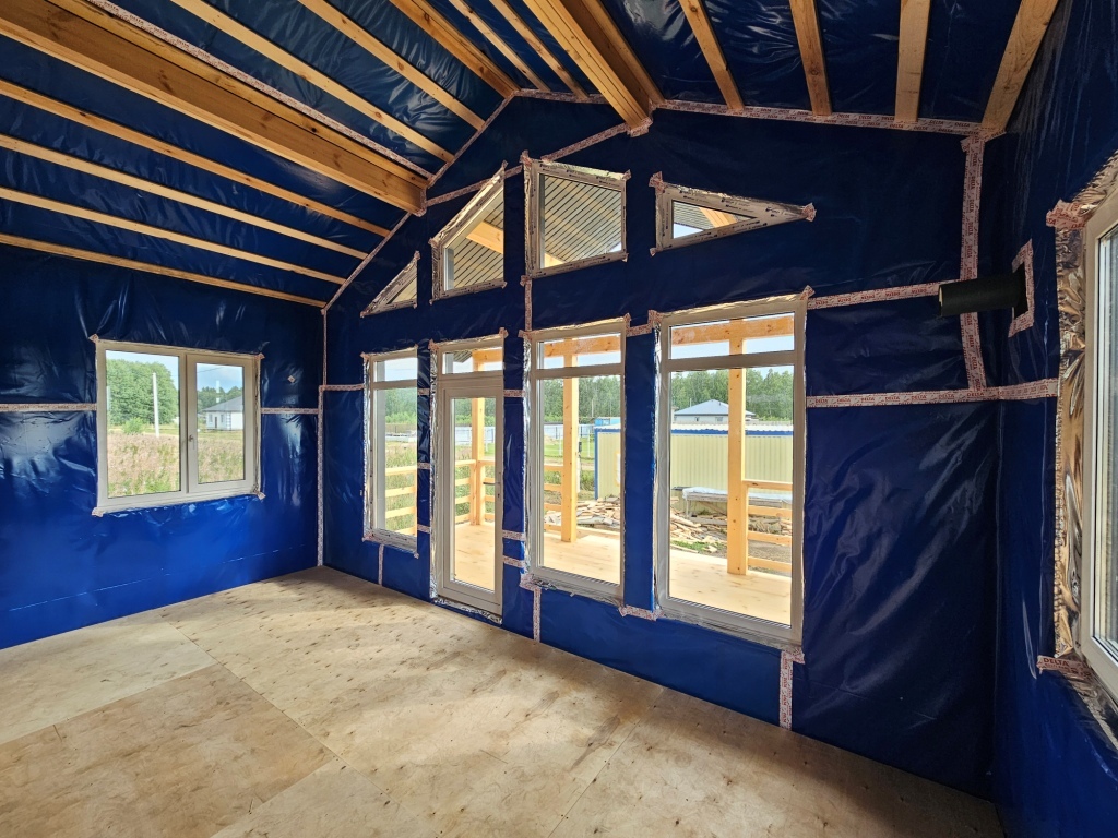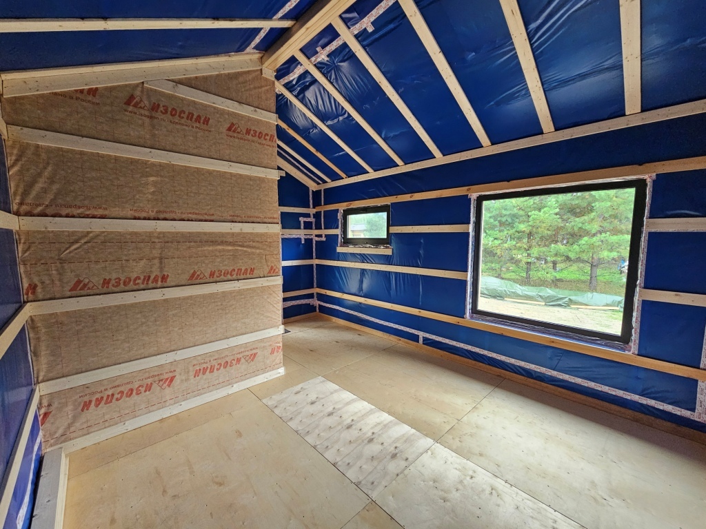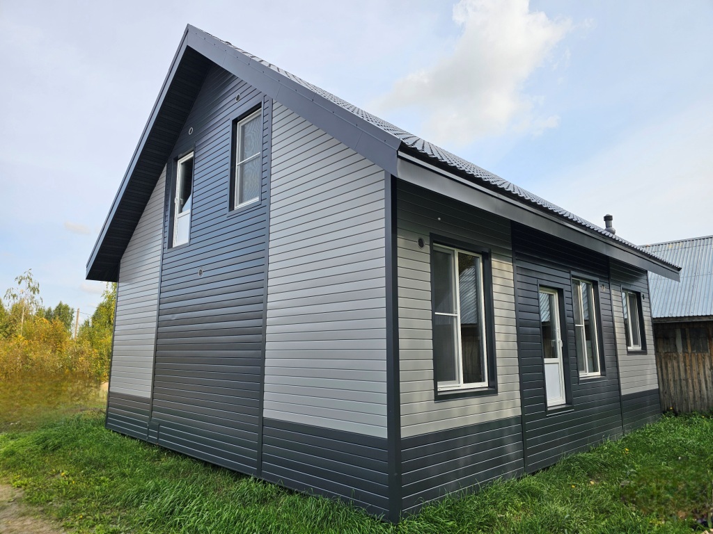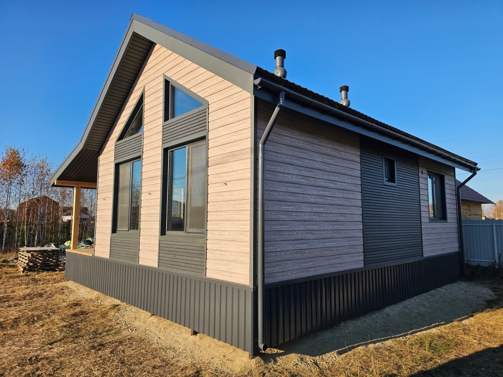 Построили каркасный дом с мансардным этажом в СНТ Лесная сказка по Велижанскому тракту. Комплектация тёплый контур с внешней отделкой. Размер по фундаменту 6х6м. ПЛАНИРОВКА: 1-й этаж: кухня, гостиная, санузел 2-й этаж мансардный (утепление по скатам кровли): коридор, две спальни ФУНДАМЕНТ: Свайно-винтовой фундамент. По результату пробного забуривания подобрали сваи диаметром 89мм длиной 3м. Снизу пол зашили металлической оцинкованной сеткой от грызунов. Диаметр проволоки 0.6мм, ячея 6мм. СИЛОВОЙ КАРКАС : Каркас стен, пола, потолка и крыши сделали из строганного пиломатериала камерной сушки. УТЕПЛЕНИЕ : Стены утеплили толщиной 150мм, пол и кровлю 200мм. Утеплитель применили базальтовый эковер Лайт, плотность 35кг/м3. Внутри утеплитель закрыли синей пароизоляцией СиЖ-П с проклейкой скотчем Delta multi band, фасад и цокольное перекрытие снизу закрыли ветрозащитой изоспан АМ, На кровле утеплитель сверху закрыли мембраной Изоспан AQ Proff. ФАСАД : Внешнюю отделку сделали металлосайдингом под брус, цвет Дуб 3д. Цоколь обшиби металлосайдингом L-брус цвет 7024 серый графит с покрытием викинг. Карнизы подшили виниловым софитом с частичной перфорацией цвет серый. КРОВЛЯ : На кровлю постелили металлочерепицу ламонтерра цвет по Ral 7024 серый графит, покрытие викинг, толщина 0.45мм. На металлочерепицу установили плоскоовальные снегозадержатели с обеих сторон крыши. ОКНА: Пластиковые с поворотно- откидными створками, двухкамерными стеклопакетами и ламинацией под дерево серого цвета