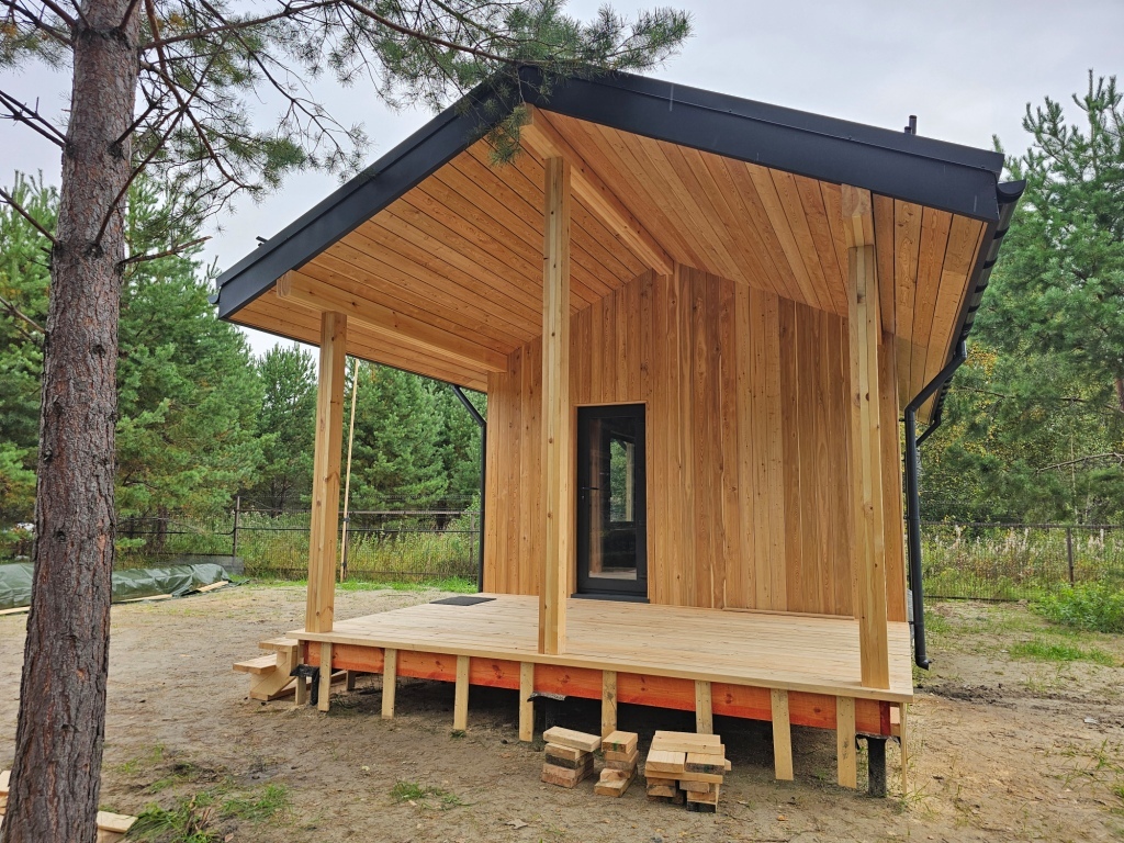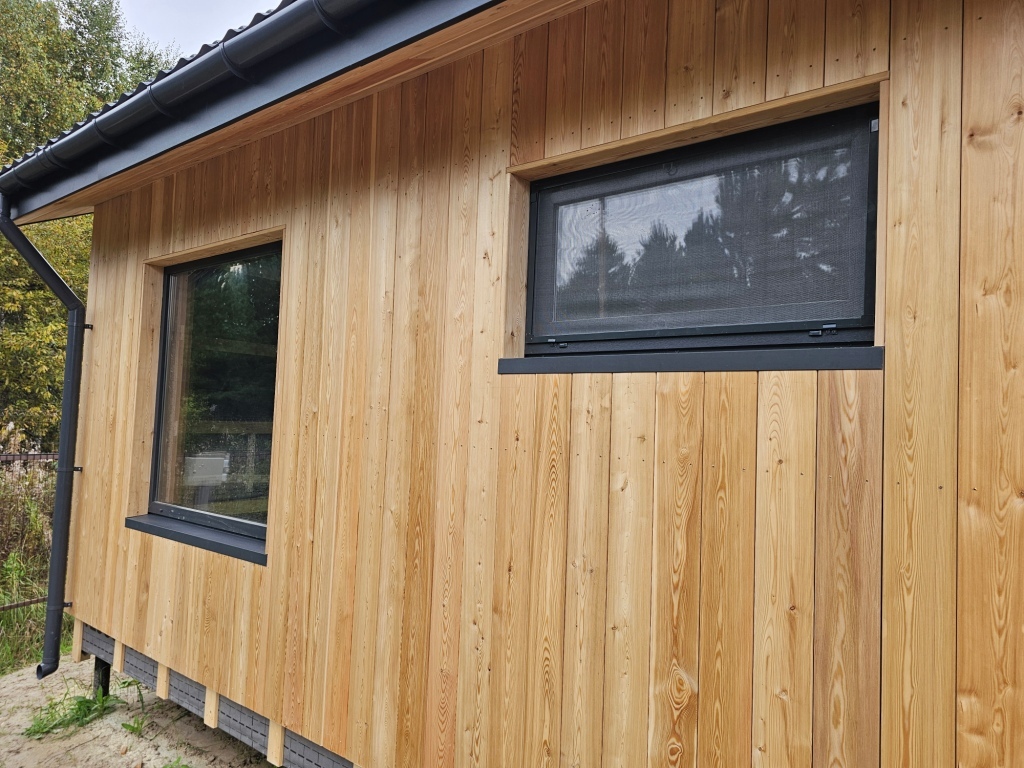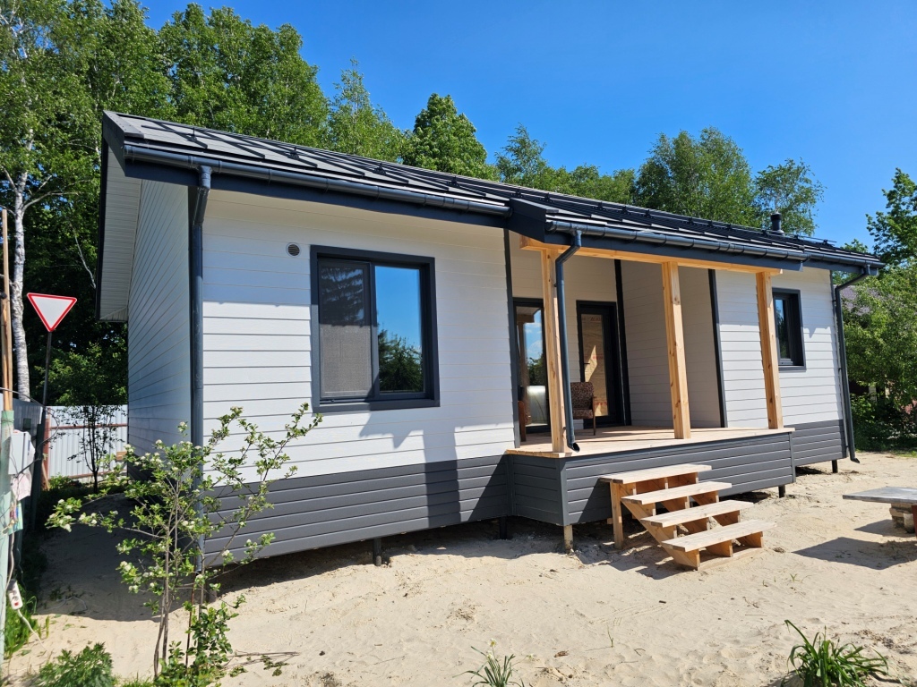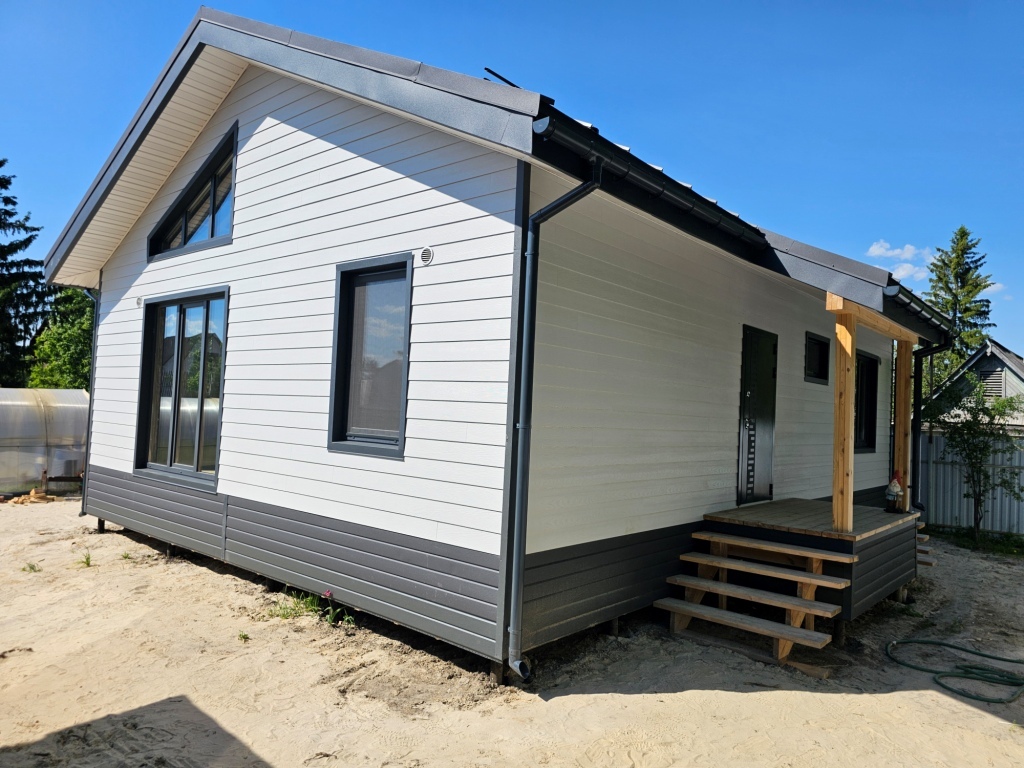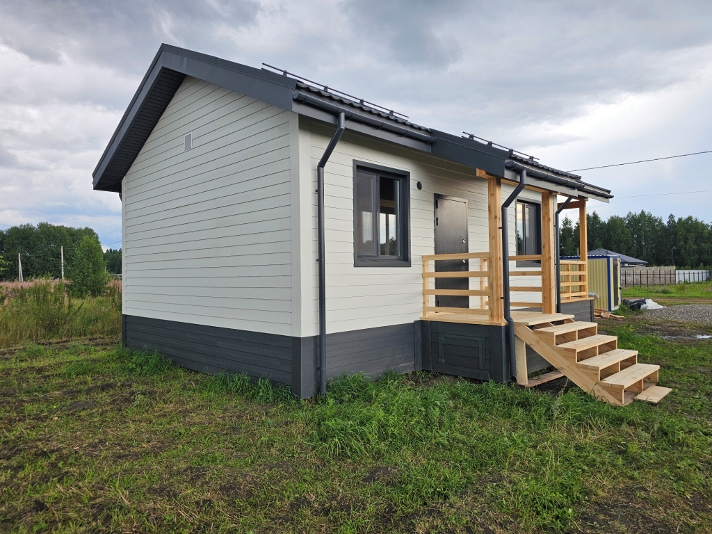 Построили каркасный дома в КП Берёза Парк по Салаирскому тракту. Размер пятна застройки 7х8м. Из которых 4х8м - тёплый контур, 3х8м открытая терраса. Дом имеет кухню-гостиную площадью 12,3м2 с панорамным остеклением, комнату 7.7м2 и санузел 3,1м2. Внешняя отделка дома фибросайдингом Дековер цвет сильвер, цоколь закрыли металлосайдингом L- Брус c брашировкой в покрытии викинг цвет серый графит. На кровлю сделали гибкую черепицу, установили ПВХ водостоки.
