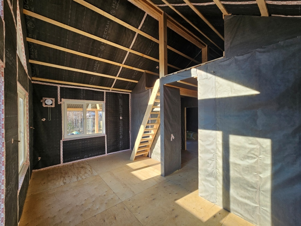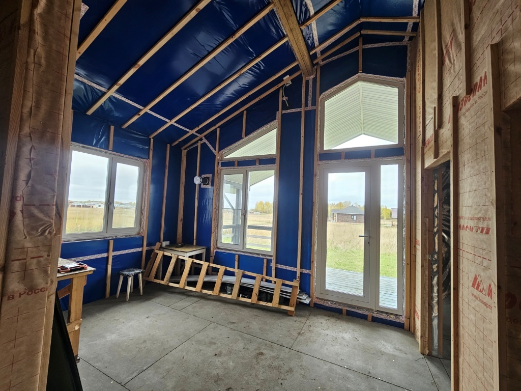 Каркасный дом в КП Дачи Хюгге по Тобольскому тракту размером 7.5х11м Общая площадь застройки 88м2, площадь тёплого контура 42м2. В доме есть открытая терраса, веранда под общей кровлей с домом, кухня-гостиная со вторым светом и большими панорамными окнами, спальня с отдельным выходом на террасу, санузел и котельная. Фундамент - винтовые сваи длиной 3м Внешняя отделка - ОСП плита 12мм, для дальнейшего нанесения декоративной штукатурки. Панорамные пластиковые окна и дверь на террасу Входная металлическая дверь с терморазрывом Кровля - профнастил МП 20 цвет 7024 серый графит, с водостоками и снегозадержателями Силовой каркас – строганная доска камерной сушки. Утепление – Эковер лайт толщина 200мм. Настил пола в доме - фанера 18мм Настил пола на террасе - доска 145х45мм сухая строганная Видеообзор по ссылкам: Ютубhttps://youtu.be/8_6JKBKxp_s?s VK видео https://vkvideo.ru/video-18 Яндекс дзен https://dzen.ru/video