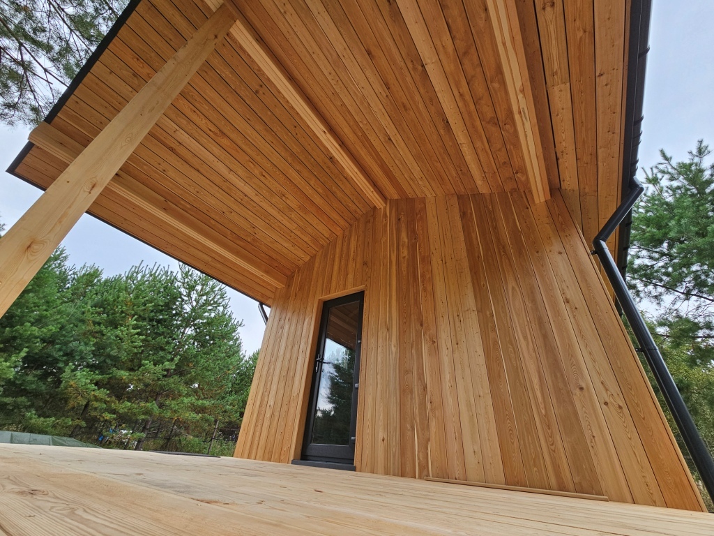 Утеплённую каркасную беседку 4х8.5м с террасой построили в с. Перевалово по Московскому тракту. Тёплая часть беседки 4х5.5м. Терраса под общей кровлей 4х3м На кровле металлочерепица с покрытием Valori цвет Grey. Установлены снегозадержатели и водостоки с обеих сторон кровли. Внешняя отделка беседки прямым планкеном из лиственницы 20х140мм вертикально с зазором 3мм. Подшивка свесов кровли и потолка на террасе так же планкеном. Окна и входная дверь с двусторонней ламинацией серого цвета, стеклопакеты с инфракрасным энергосберегающим напылением.