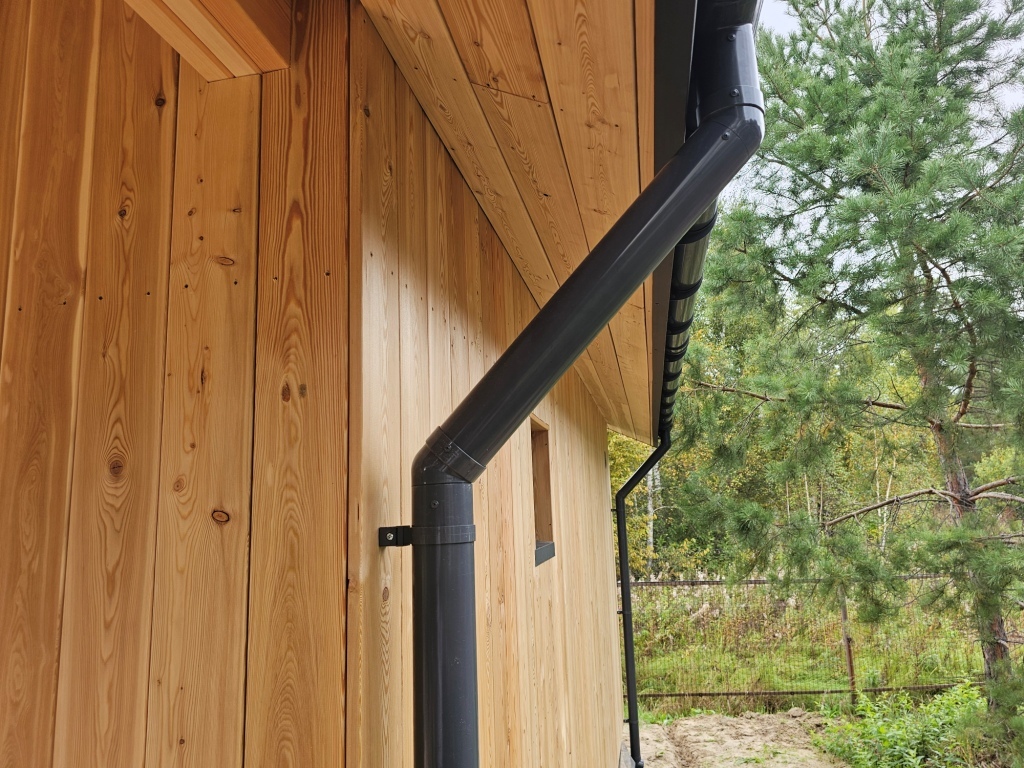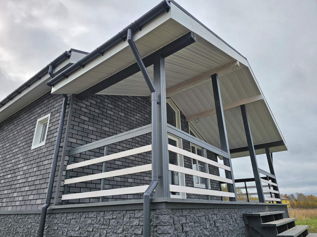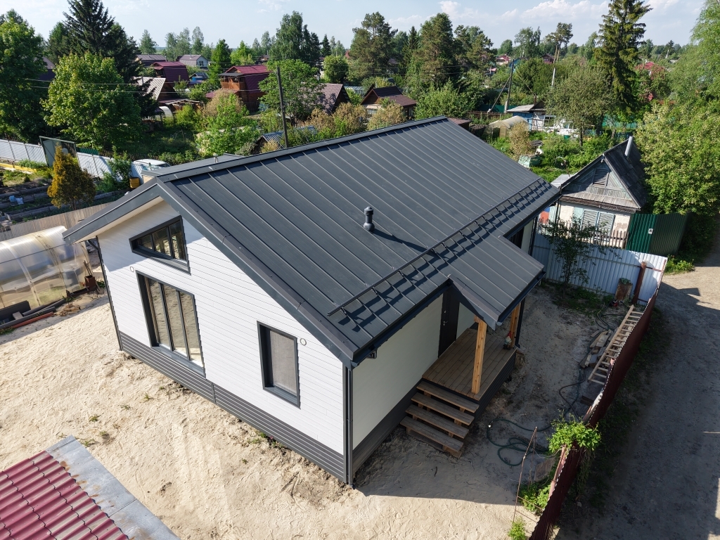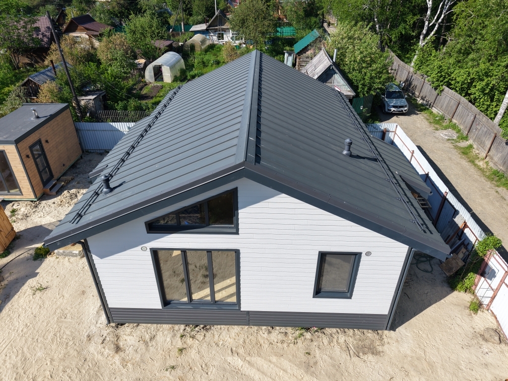 В СНТ Лесник-2 по Московскому тракту построили каркасный дом размером 8,5х13м. В доме есть кухня-гостиная S =40 м2, три спальни S = 11м2, 12,6 и 12,6м2 (в одной спальне есть гардеробная 4м2), терраса с выходом из кухни-гостиной S = 11,8м2, техническое помещение S=3м2, два санузла 3м2 и 4.4м2. Фасад дома комбинированный: основной материал профнастил С20 цвет серый графит покрытие Viking, смонтированный вертикально и вставки из металлосайдинга брус цвет Дуб 3Д горизонтально. На кровлю постелили металлочерепицу цвет серый графит. Установили снегозадержатели, выходы вентиляции и водосточную систему. Свесы кровли, потолок на террасе и крыльце подшили металлосайдингом софит под дерево. Окна с ламинацией в цвете графит. Дом построили из строганной доски камерной сушки с применением LVL бруса для формирования большого пространства и высоких потолков в кухне-гостиной.
