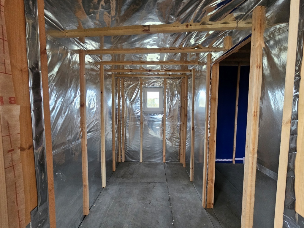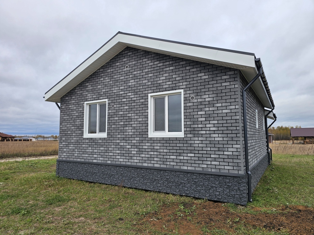 КП Московские усадьбы по Московскому тракту построили одноэтажный каркасный дом размером 10х10 м на ленточном фундаменте заказчиков. Для уменьшения батутности пола в цокольном перекрытии применили двутавровые деревянные балки. Комплектация тёплый контур, дом полностью готов снаружи и утеплён. ПЛАНИРОВКА: Кухня-гостиная S = 16 м2, санузел S = 5 м2, холл S = 3,3 м3, тамбур S = 2 м2, спальня №1 S = 14,3 м2, спальня № 2 S = 14,3 м2 и спальня №3 S = 11,8 м2 ФУНДАМЕНТ: Ленточный, железобетонный. В качестве лаг пола в цокольном перекрытии применили двутавровые деревянные балки сечением 290мм и длиной почти 5м. Снизу пол зашили металлической оцинкованной сеткой от грызунов. Диаметр проволоки 0.6мм, ячея 6мм. СИЛОВОЙ КАРКАС : Каркас стен, пола, потолка и крыши сделали из строганного пиломатериала камерной сушки. УТЕПЛЕНИЕ : Стены утеплили толщиной 200мм, пол и кровлю 250мм. Утеплитель применили базальтовый эковер Лайт, плотность 35кг/м3. Внутри утеплитель закрыли пароизоляционной плёнкой 200 микрон с проклейкой скотчем Delta multi band, кровлю, фасад и цокольное перекрытие снизу закрыли мембраной изоспан АМ. ФАСАД : Внешнюю отделку сделали металлосайдингом под брус, цвет 7004. Цоколь обшили фасадными панелями Грандлайн крупный камень цвет графит Карнизы подшили виниловым софитом с частичной перфорацией цвет графит КРОВЛЯ : На кровлю постелили профнастил МП 20 цвет по Ral 7024 серый графит. ОКНА: Пластиковые с поворотно- откидными створками, трёхкамерный профиль, двойной стеклопакет, с москитными сетками ВХОДНАЯ ДВЕРЬ: металлическая с утеплителем и терморазрывом ВТОРАЯ ДВЕРЬ: пластиковая с двойным стеклопакетом