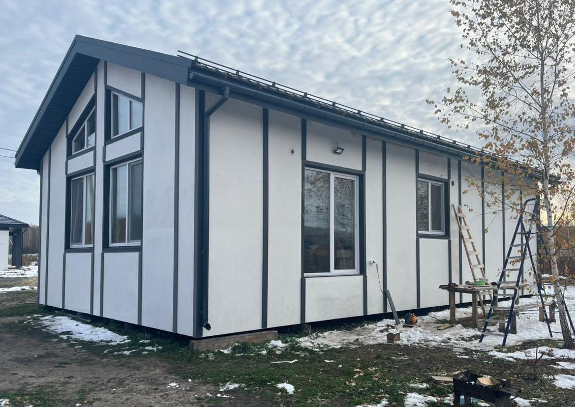 Каркасный дом 6х10,5м со вторым светом в кухне-гостиной и террасой под общей кровлей с домом построили по индивидуальному проекту в КП Sun Village (д. Якуши) по Старотобольскому тракту. Отделку фасада дома сделали комбинированную. Три стороны дома обшили фиброцементным сайдингом дековер цвет Gray по цоколю и Snow основной фасад. Лицевой фасад обшили планкеном 20х90мм вертикально. На кровлю постелили металлочерепицу цвет серый графит 7024. Установили ПВХ водостоки и плоскоовальные снегозадержатели. Карнизы и потолок на террасе и крыльце подшили ПВХ софитом серого цвета. Установили окна с ламинацией под дерево серого цвета и входную дверь с терморазрывом. Планировка: совмещённая кухня-гостиная S = 17м², терраса S = 13,9м², спальня №1 S = 6,7м², спальня №2 S = 6,7м², коридор S = 3,7м², санузел S=2,8м², прихожая S = 2,8м², крыльцо S = 2,7м² Видеообзор по ссылкам: Ютубhttps://youtu.be/p_s?s VK видео https://vkvideo.ru/video-185 Яндекс дзен https://dzen.ru/video/watch/673 Рутубhttps://rutube.ru/video/78