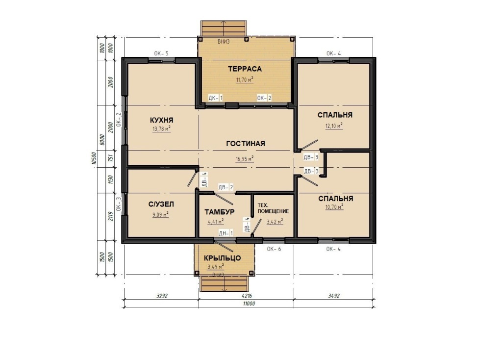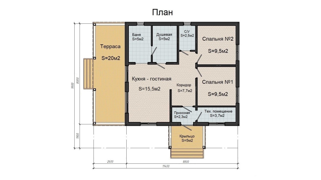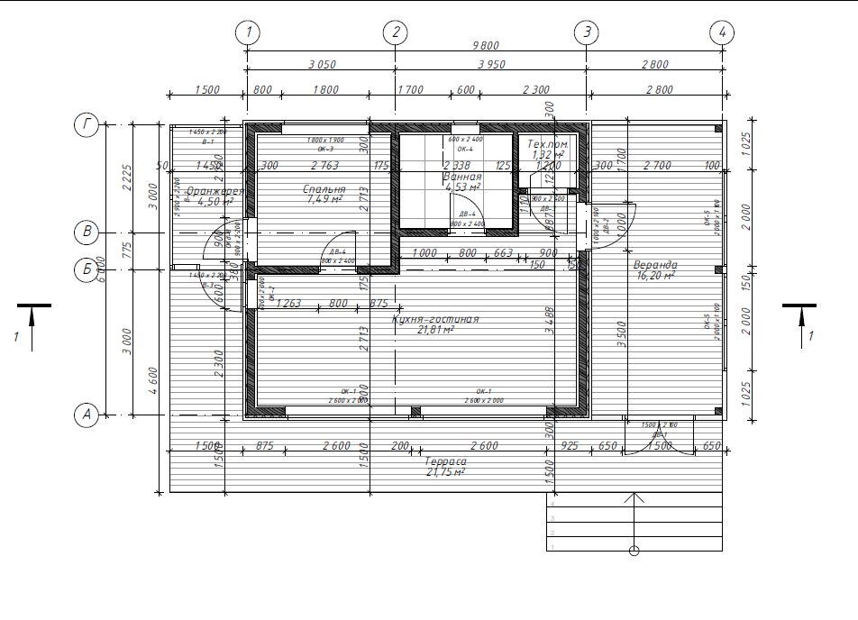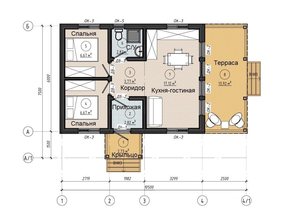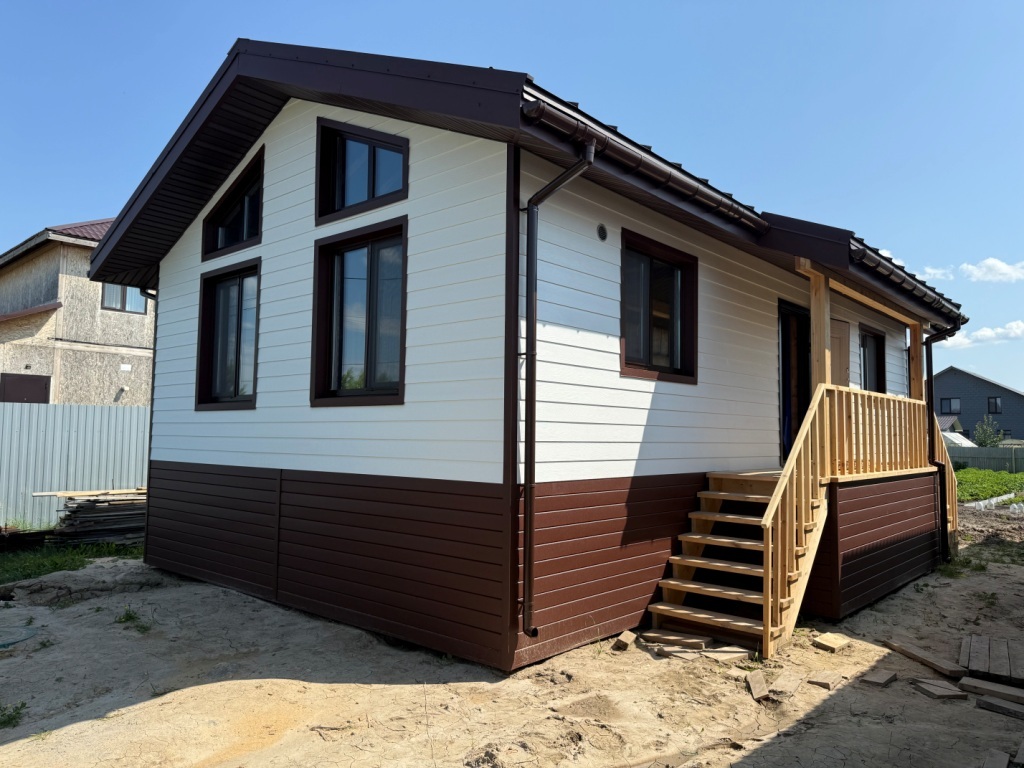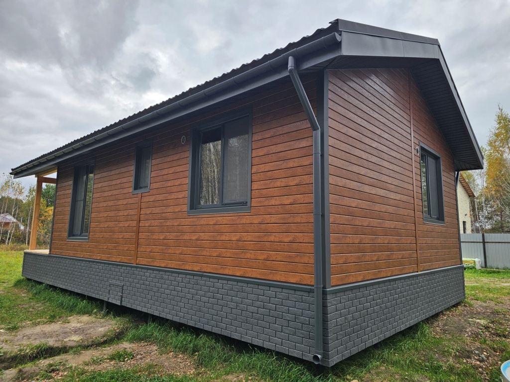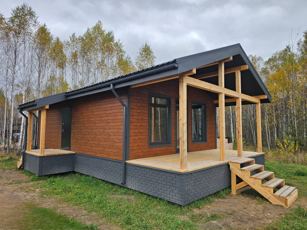 ПЛАНИРОВКА: Дом имеет кухню- гостиную, две спальни и санузел ФУНДАМЕНТ: Из-за большого перепада высот уровня земли применили свайно-винтовой фундамент. По результатам исследования грунтов подобрали сваи диаметром 89мм толщиной стенки 6мм, длиной от 3.5 до 4.0м с двумя лопастями. Снизу пол зашили металлической оцинкованной сеткой от грызунов. Диаметр проволоки 0.6мм, ячея 6мм. ДЕРЕВЯННЫЙ КАРКАС : Каркас стен, пола и потолка сделали из пиломатериала камерной сушки. Стены и потолок: доска 50х150мм, пол доска 50х200мм УТЕПЛЕНИЕ : Стены утеплили толщиной 150мм, пол и потолок 200мм. Утеплитель применили базальтовый эковер Лайт, плотность 35кг/м3. Внутри утеплитель закрыли пароизоляцией изоспан В, снаружи ветрозащитой изоспан А, сделали вент зазор. ФАСАД : Внешнюю отделку сделали металлосайдингом под брус, цвет орех 3д. Карнизы подшили виниловым сайдингом белого цвета. КРОВЛЯ : На кровлю постелили металлочерепицу монтеррей цвет 8017 шоколадно-коричневый, толщина 0.45мм ОКНА: Пластиковые с поворотно- откидными створками, двухкамерными стеклопакетами 120см х 130см - 3шт (кухня-гостиная, спальня, спальня) 60см х 130см - 1шт (кухня- гостиная) 50см х 50см - 1шт (санузел) ВХОДНАЯ ДВЕРЬ: Входная дверь металлическая с терморазрывом ВНУТРЕННЯЯ ОТДЕЛКА: Отделка стен МДФ панелями вертикально. Цвет натуральный ДУБ. На пол постелили берёзовую фанеру ЭЛЕКТРИКА: Скрытая разводка электрики в ПВХ гофре. Срок строительства 3 недели.