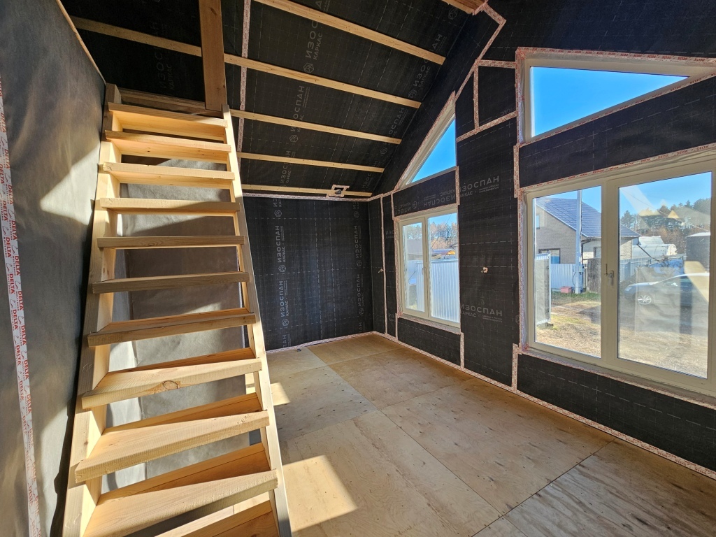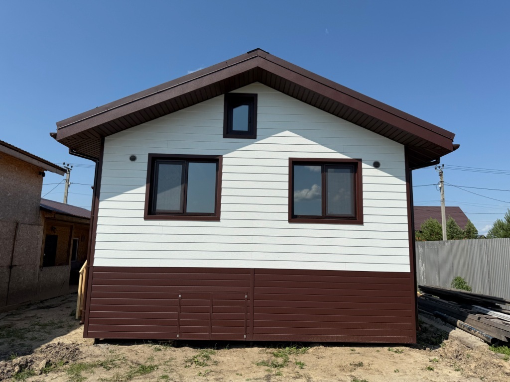 Двухэтажный каркасный дом 6*6 м с террасой 6*2,5 м построили в СНТ Самоцветы по Велижанскому тракту. Комплектация тёплый контур, дом полностью готов снаружи и утеплён ПЛАНИРОВКА: 1-й этаж: кухня-гостиная S = 16 м2, санузел S = 5 м2, холл S = 3,3 м3, тамбур S = 2 м2, лестница S = 5м2, терраса S = 14,4 м2 2-й этаж мансардный (утепление по скатам кровли): лестница S = 5 м3 , одна спальня S = 16 м2, вторая спальня и S = 10 м2 ФУНДАМЕНТ: Свайно-винтовой фундамент. По результату пробного забуривания подобрали сваи диаметром 89мм длиной 3м. Снизу пол зашили металлической оцинкованной сеткой от грызунов. Диаметр проволоки 0.6мм, ячея 6мм. СИЛОВОЙ КАРКАС : Каркас стен, пола, потолка и крыши сделали из строганного пиломатериала камерной сушки. УТЕПЛЕНИЕ : Стены утеплили толщиной 150мм, пол и кровлю 200мм. Утеплитель применили базальтовый эковер Лайт, плотность 35кг/м3. Внутри утеплитель закрыли пароизоляционной плёнкой 200 микрон с проклейкой скотчем Delta multi band, кровлю, фасад и цокольное перекрытие снизу закрыли мембраной изоспан АМ. ФАСАД : Внешнюю отделку сделали металлосайдингом под брус, цвет Дуб 3д. Цоколь обшиби фасадными панелями Грандлайн колотый камень цвет коричневый Карнизы подшили виниловым софитом с частичной перфорацией цвет белый. КРОВЛЯ : На кровлю постелили металлочерепицу монтеррей цвет по Ral 8017 шоколадно-коричневый. На металлочерепицу установили плоскоовальные снегозадержатели с обеих сторон крыши. Вдоль всей кровли установили пластиковые водостоки ОКНА: Пластиковые с поворотно- откидными створками, двухкамерными стеклопакетами и ВХОДНАЯ ДВЕРЬ: металлическая с утеплителем и терморазрывом