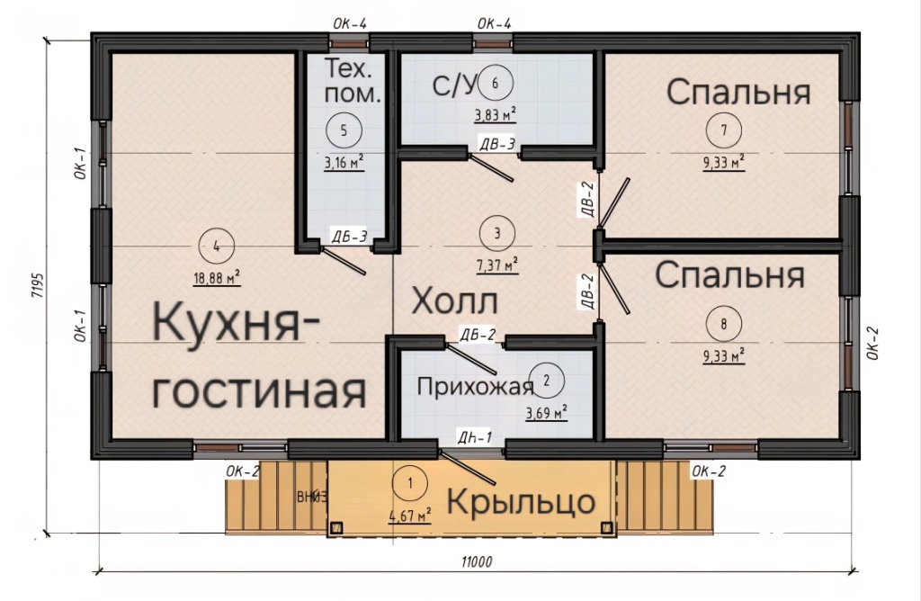 Каркасный дом 6х11м со вторым светом и высокими потолками построили в д. Парёнкина по Старотобольскому тракту. Отделку фасада дома сделали комбинированную. Основной фасад обшили фиброцементным сайдингом дековер цвет Snow. Цоколь обшили металлосайдингом L-брус цвет 8017 покрытие Viking. На кровлю постелили Кликфальц цвет 8017 покрытие Viking. Установили ПВХ водостоки и плоскоовальные снегозадержатели. Карнизы и потолок на крыльце подшили ПВХ софитом коричневого цвета. Установили окна с ламинацией под дерево коричневого цвета и входную дверь с терморазрывом. Планировка: совмещённая кухня-гостиная S = 18,9м², спальня №1 S = 9,3м², спальня №2 S = 9,3м², холл S = 7,3м² санузел S=3,8м², прихожая S = 3,6м², тех.помещение S = 3,1м², крыльцо S = 4,6м²