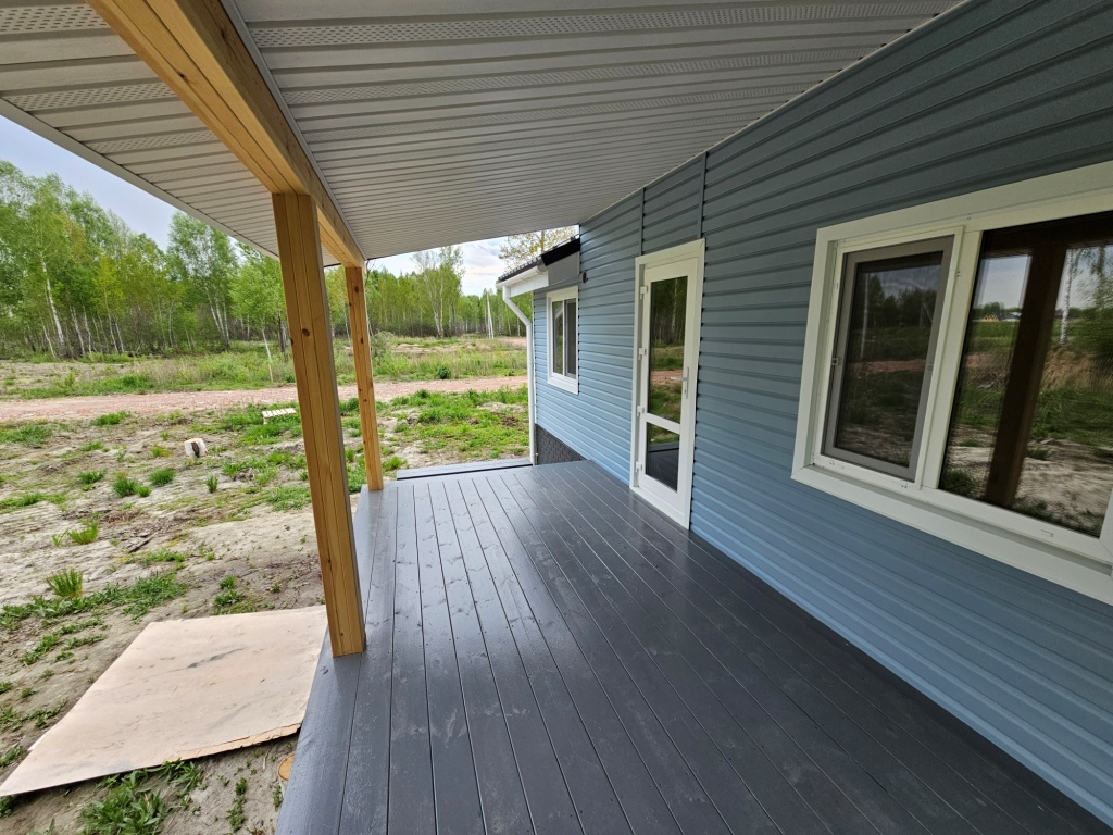 В СНТ Здоровье-3 по Велижанскому тракту построили каркасный дом 9 х 12м со вторым светом, антресолью в детской комнате и угловой террасой. Дом имеет: угловую террасу S = 35м2 под общей кровлей с домом, кухню-гостиную S = 29м2 со вторым светом и выходом на террасу, две спальни площадью S = 9м2 и S = 11м2 (во второй спальне сделали антресольный этаж - дополнительное спальное место), два санузла S = 4м2 и S = 2м2, тех.помещение S = 2м2 и тёплый тамбур S = 3,7м2. Внешнюю отделку дома сделали комбинированную. Цоколь обшили металлосайдингом Л-Брус цвет серый графит в покрытии викинт. Основной фасад дома обшили фиброцементным сайдингом Дековер цвет Snow, вставки под окнами и лицевая часть дома цвет Mokko. Свесы кровли и потолок на террасе подшили виниловым сайдингом Docke PREMIUM Сайдинг Брус D6S цвет Сливки. На кровле металлочерепица супермонтеррей RAL 7024 (графит) покрытие Викинг, снегозадержатели и водостоки грандлайн серого цвета. Окна и обе входные двери пластиковые с тройным остекление, профиль пятикамерный с двусторонней ламинацией цвет серый антрацит, фальц крашеный в серый цвет. Внутреннюю отделку заказчики сделали самостоятельно вагонкой сорта Экстра толщиной 14мм с окрашиванием на заводе